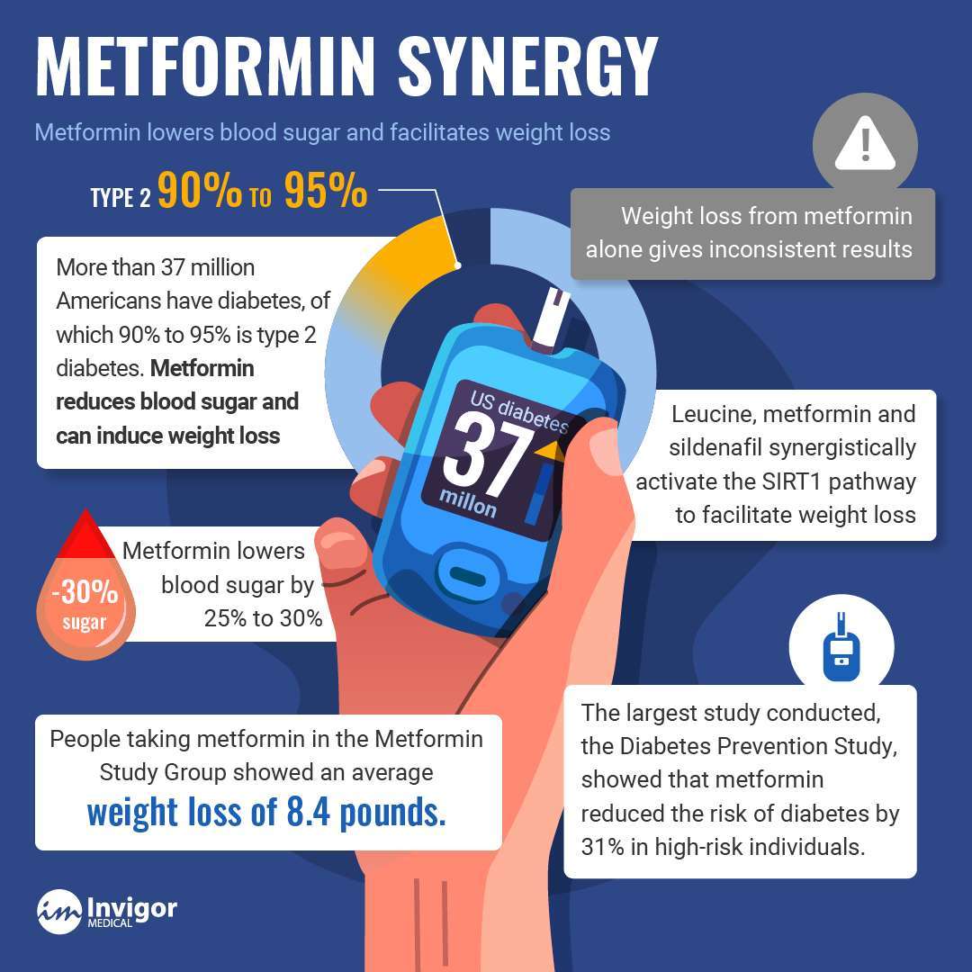 Leucine, metformin, and sildenafil synergistically work to reduce fat mass and triglycerides by activating SIRT1, according to a phase 2 clinical trial. Weight loss during the 16-week study period was linear, which suggests it will continue at the same rate. Activating Sirt1 is expected to support weight loss, improve cardiovascular function, and improve lipid metabolism. Restoring B12 levels is also expected to help with weight loss.