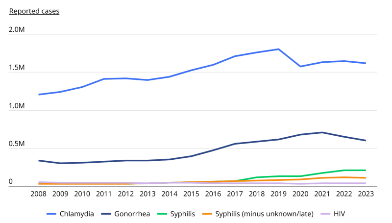 The number of newly reported sexually transmitted infections in the U.S. has climbed sharply over the past decade. In 2023, health officials recorded approximately 2.5 million new cases of Chlamydia, Gonorrhea, Syphilis, and HIVโup from 1.8 million in 2013.