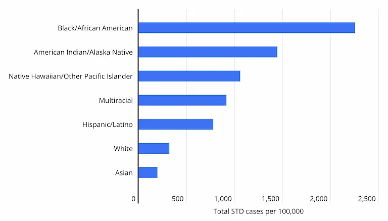 Racial and ethnic disparities in STD cases remain one of the most persistent and pronounced features of the epidemic. In 2023, Black Americans had a reported STD rate more than seven times higher than that of White Americansโ2,249.7 cases per 100,000 compared to 319.0, respectively. This gap reflects long-standing inequities in healthcare access, prevention resources, and social determinants of health.